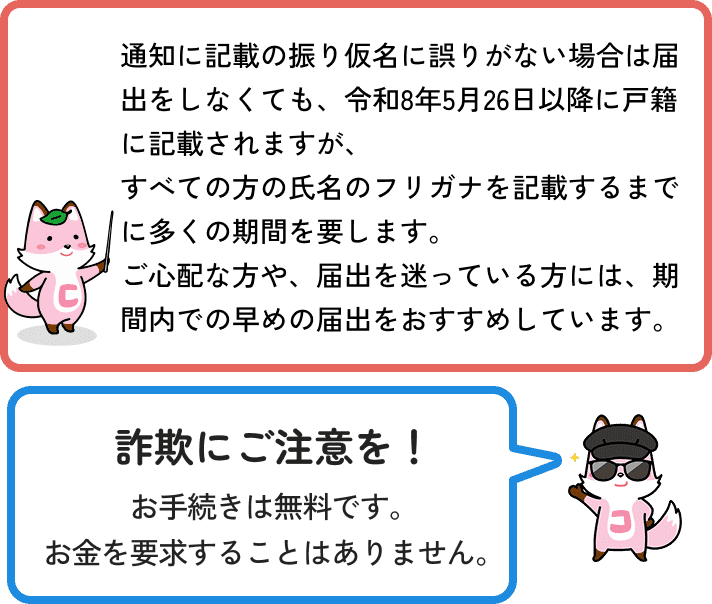改正法の施行日(令和7年5月26日)後1年以内に限り、氏名のフリガナの届出をすることができます。